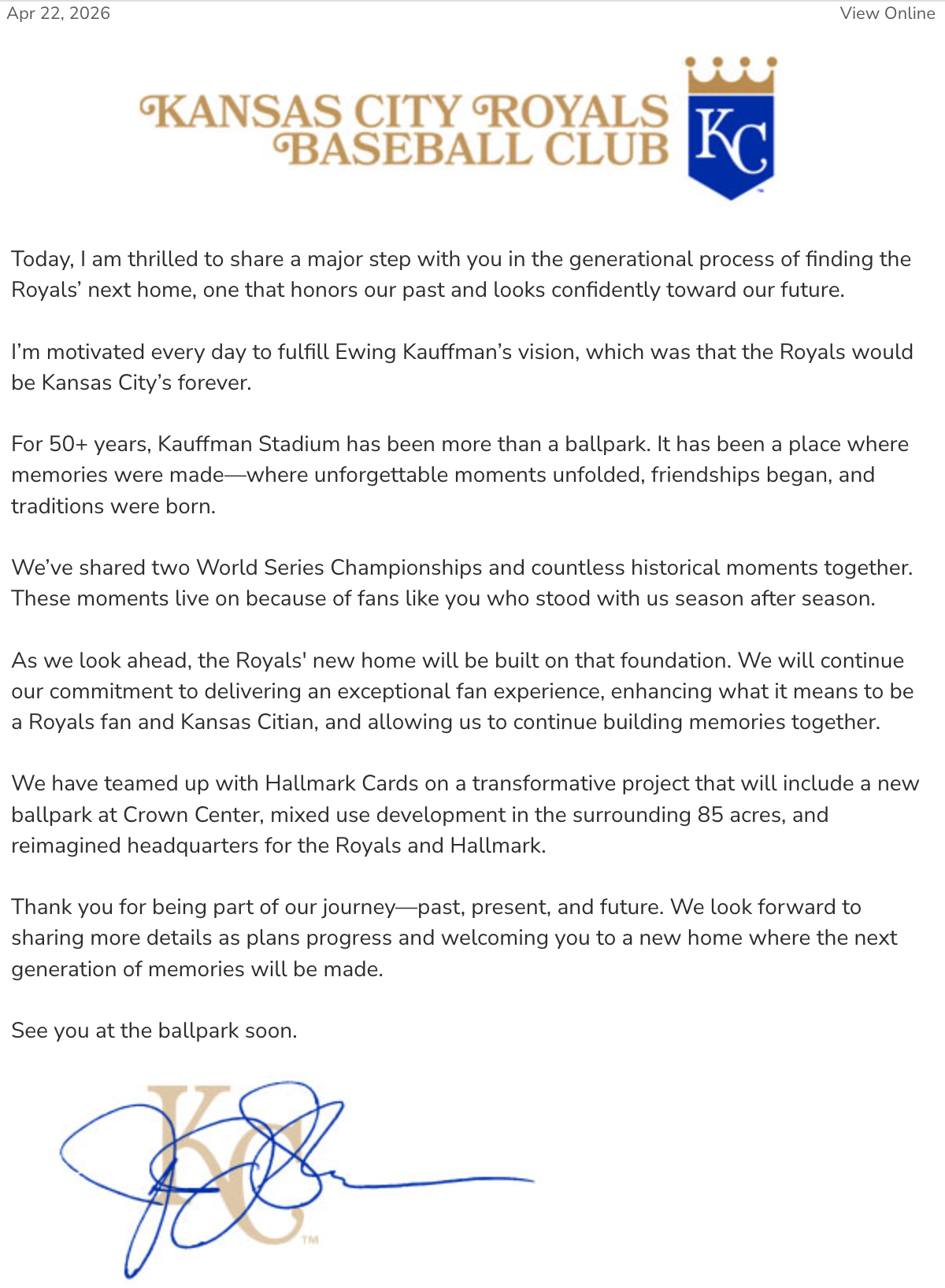 "Today's announcement reinforces that the State of Missouri is not just where the Kansas City Royals play, but where they belong," Kehoe. "This decision by the Royals to invest in our state is more than just a commitment to Kansas City, it is a commitment to communities and fans across Missouri. I appreciate the partnership of the Royals organization, Hallmark, and state and local leaders in working together to make this project a reality."