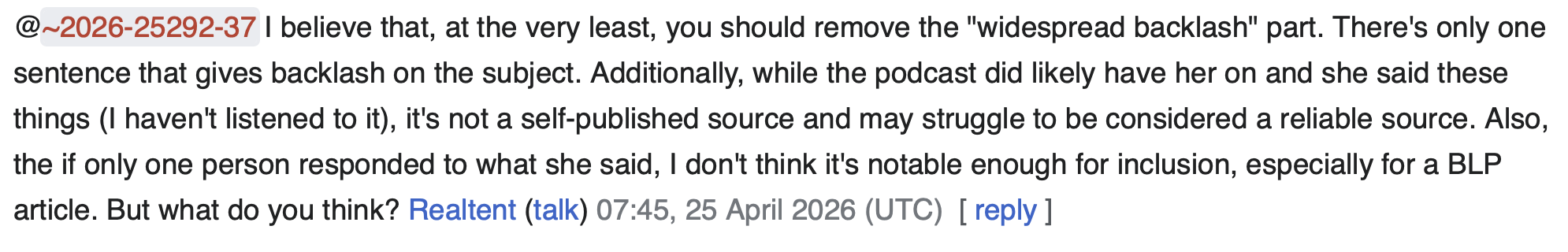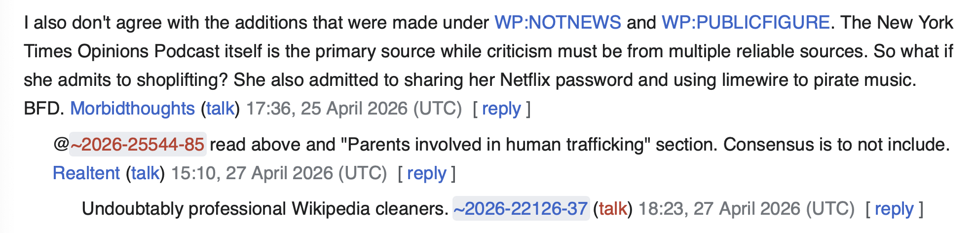 The same editor asked, "So what if she admits to shoplifting? She also admitted to sharing her Netflix password and using limewire to pirate music." A different editor, apparently shocked by the decision to exclude Tolentino's remarks from her Wikipedia page, wrote, "Undoubtably professional Wikipedia cleaners."