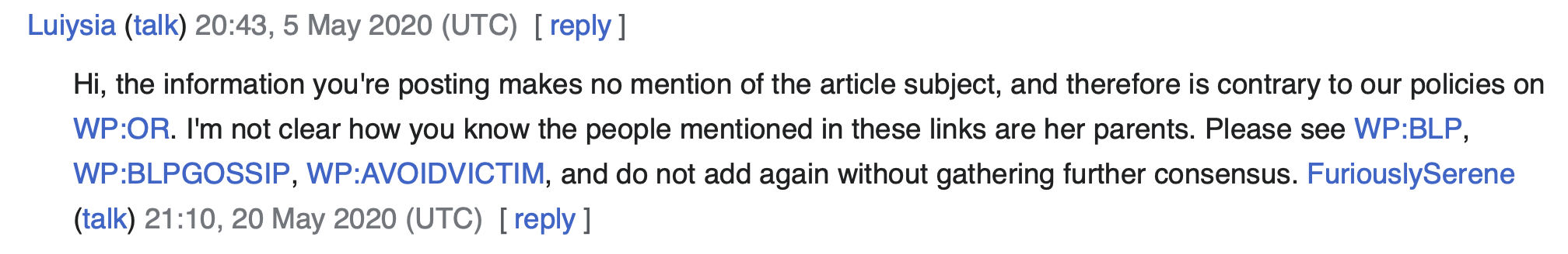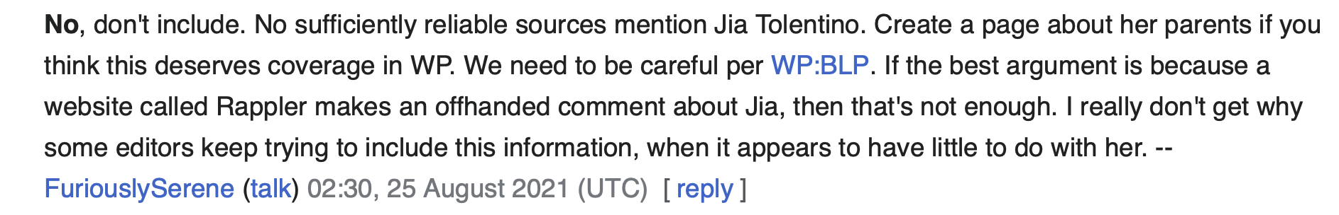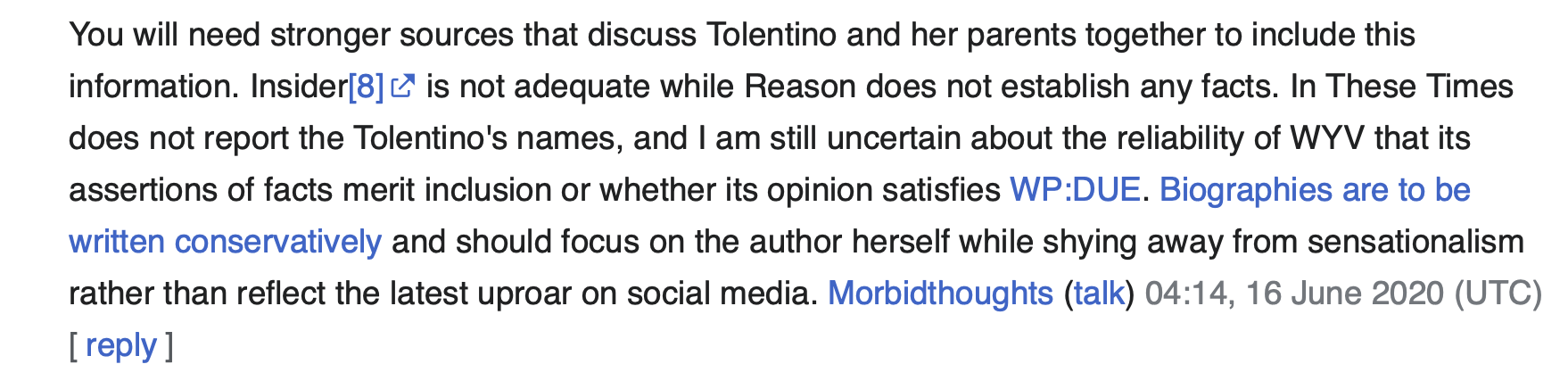 The issue resurfaced in 2021, and the same Wikipedia editor argued against including the information about Tolentino's parents because doing so would give undue "weight to social media and blog blatherings."