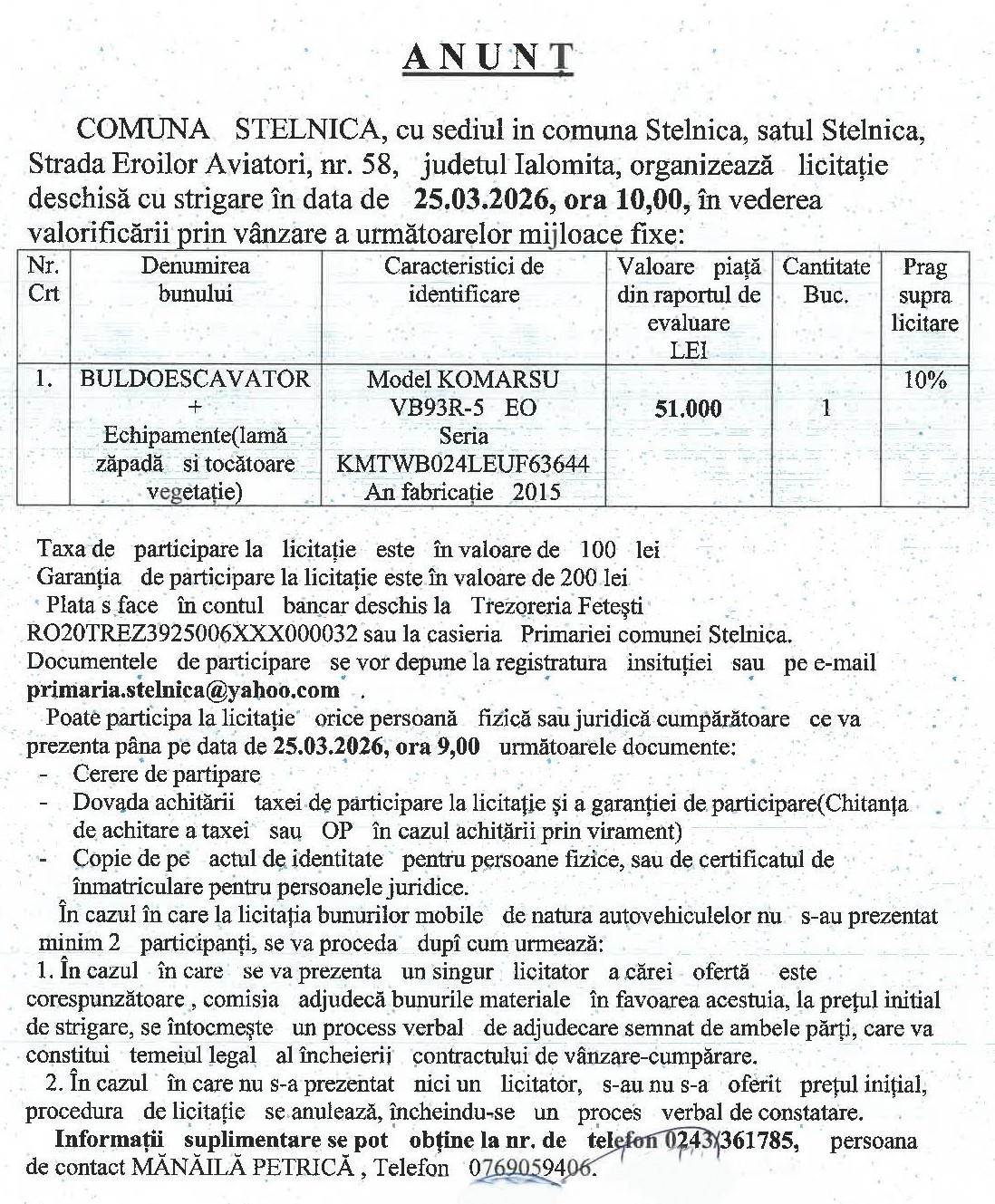 Primăria Stelnica vinde la licitație un buldoexcavator